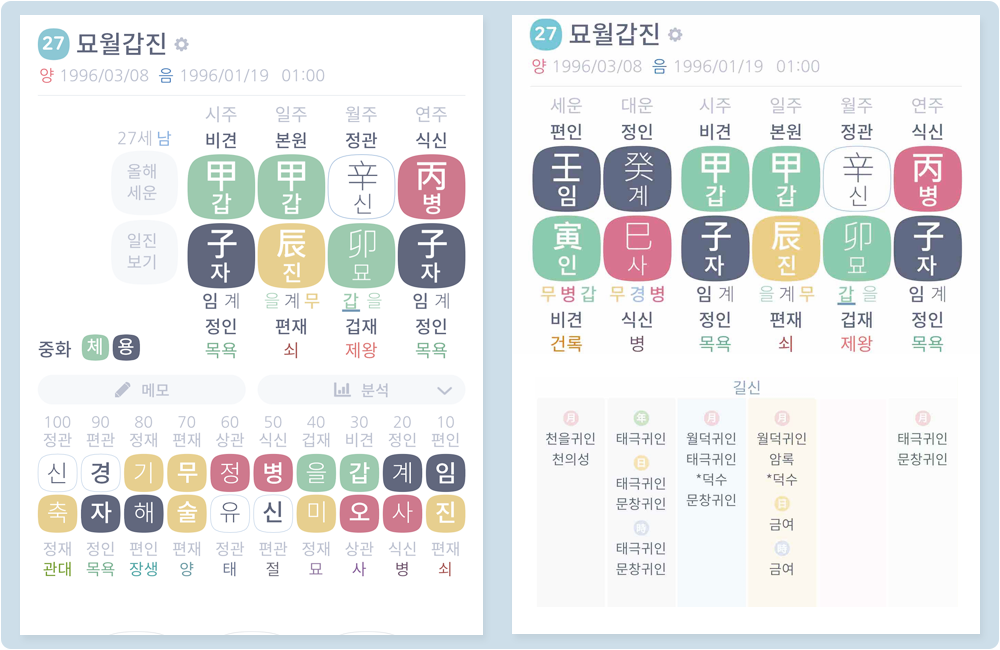 길신외에도 다른신살들이 어떤 작용을 하고 있는지 자세히 알 수 있습니다.