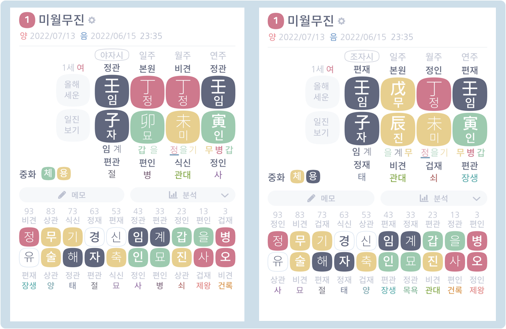 2022년 7월 13일생으로 야자시를 적용하면 7월 13일인 정묘일주가 됩니다. 조자시를 적용하면 14일인 무진일주가 됩니다.